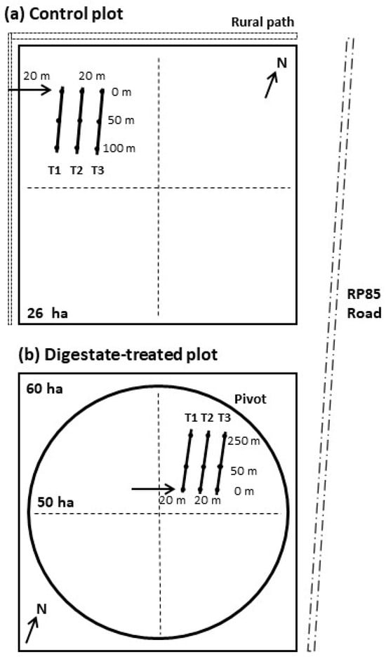 Spatial representation of the control and digestate-irrigated fields. The control field is located 14 km north of the digestate–irrigated plot, along Provincial Road N°85. Three transects (T1–T3) were established in each plot, proportional to the area of each one. Plots and their elements are not drawn to scale. (a) In the control plot, the transects were 100 m long, separated by approximately 20 m. Samples were taken at 0 m, 50 m, and 100 m. (b) In the digestate-treated plot, the transects were 250 m long, separated by approximately 20 m. Samples were taken at the Upslope (0 m), Mid-slope (50 m), and Downslope (250 m) locations. The 50-ha circle represents the area irrigated by the pivot.