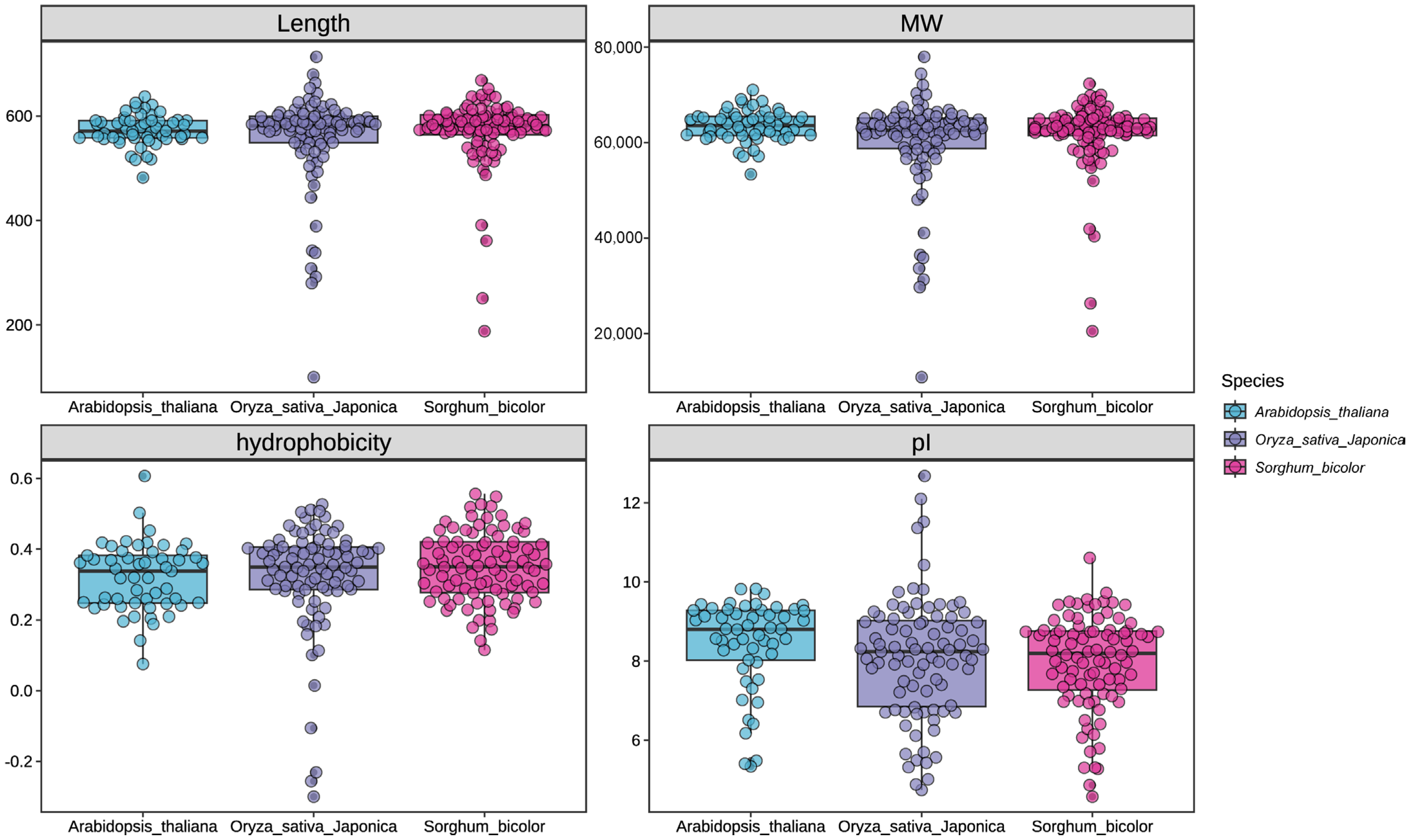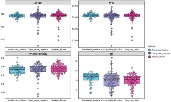 Characteristics of NPF family members in Arabidopsis thaliana, Oryza sativa and Sorghum bicolor including protein length, molecular weight (MW), protein isoelectric point (pI) and hydrophilicity.