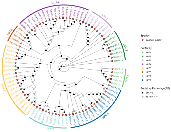 The evolutionary examination of the NPF protein sequences in sorghum. These 88 NPF proteins were categorized into eight distinct subgroups, labeled NPF1–NPF8.