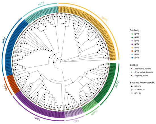 The evolutionary examination of the NPF protein sequences in Arabidopsis thaliana, Oryza sativa and Sorghum bicolor. The NPF proteins were categorized into eight distinct subgroups, labeled NPF1–NPF8.