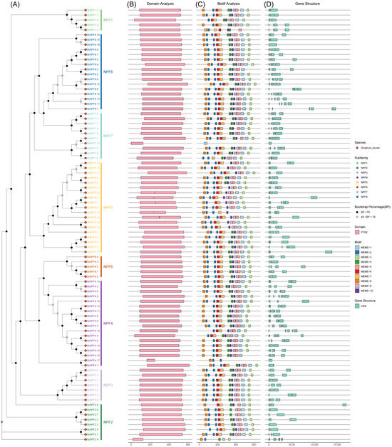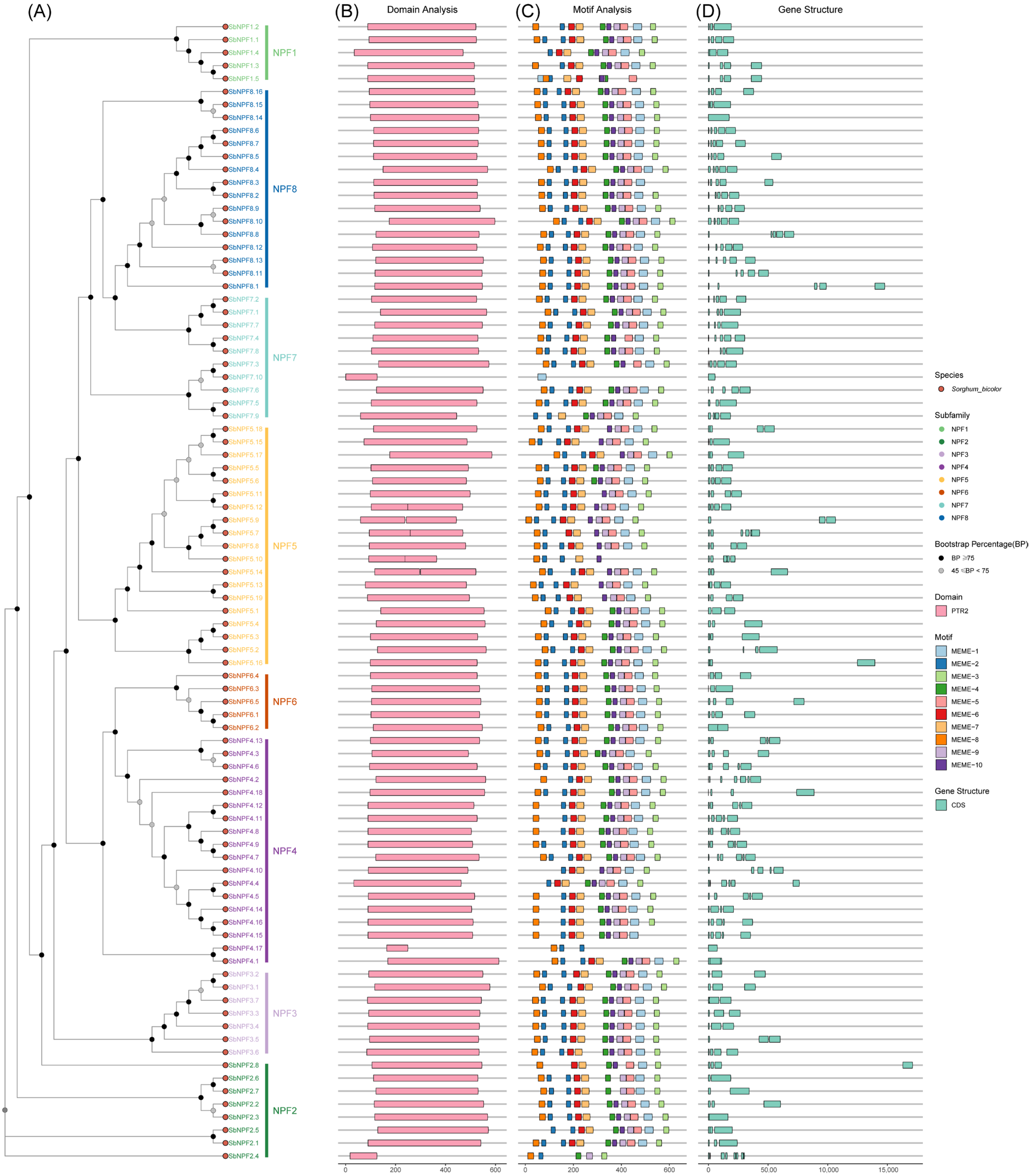 Analysis of phylogenetic relationships, conserved domains, motifs, and gene structures related to NPF genes in sorghum. (A) Phylogenetic tree of NPF proteins; (B) conserved domains in NPF protein sequences; (C) distribution of 15 conserved motifs in NPF proteins; (D) gene structure of NPF genes.