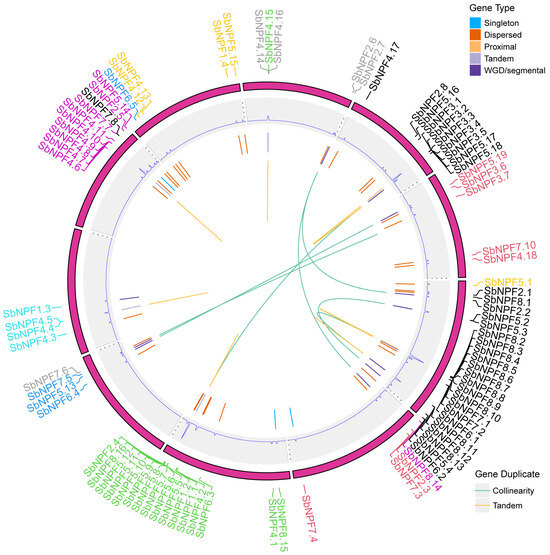 This study used the MCScan tool to analyze gene duplication events and elucidate amplification patterns of the SbNPF gene family members in sorghum to reveal evolutionary duplication events. Figure 5 shows the results, which reveal that a total of 22 pairs of tandemly repeated genes were identified. Additionally, ten pairs of segmental duplication genes were identified in the sorghum SbNPF gene family (Supplemental Table S3). These results suggest that tandem duplication plays a dominant role in the evolution of the SbNPF gene family.
