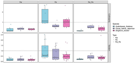 The value of Ka, Ks and Ka/Ks of Arabidopsis thaliana, Oryza sativa and Sorghum bicolor. MCScanX was used to calculate the value of Ka, Ks, and Ka/Ks. Ka/Ks value of >1 signifies the gene is subjected to positive selection; Ka/Ks value of 1 indicates neutral selection; Ka/Ks value of <1 represents negative purifying selection.