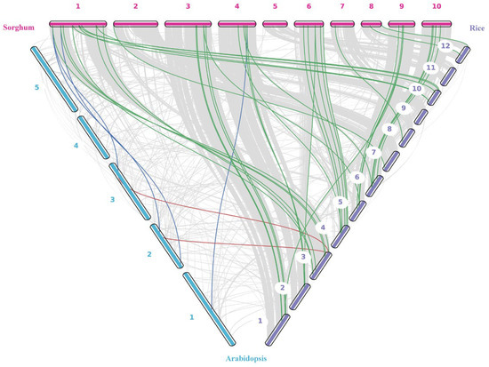 Syntenic analysis of NPF genes between Oryza sativa, Arabidopsis thaliana, Sorghum bicolor, respectively. The collinear blocks and NPF homologous genes pairs were shown by gray, red and green lines, respectively. The numbers indicated the chromosomes of each species.