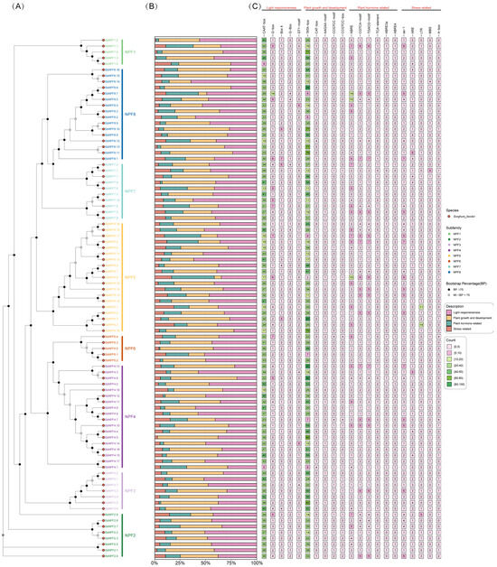 Cis-elements analysis of NPF genes in sorghum. (A) Phylogenetic tree of NPF proteins; (B) bar chart illustrating the summary of cis-acting elements, with colors denoting various functional categories; (C) distribution of cis-acting element counts, with colors indicating different count ranges.