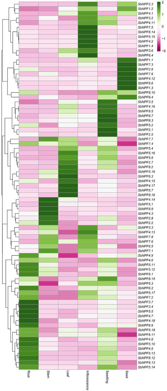 Analysis of the expression patterns of SbNPF genes across various tissues by RNA-Seq.