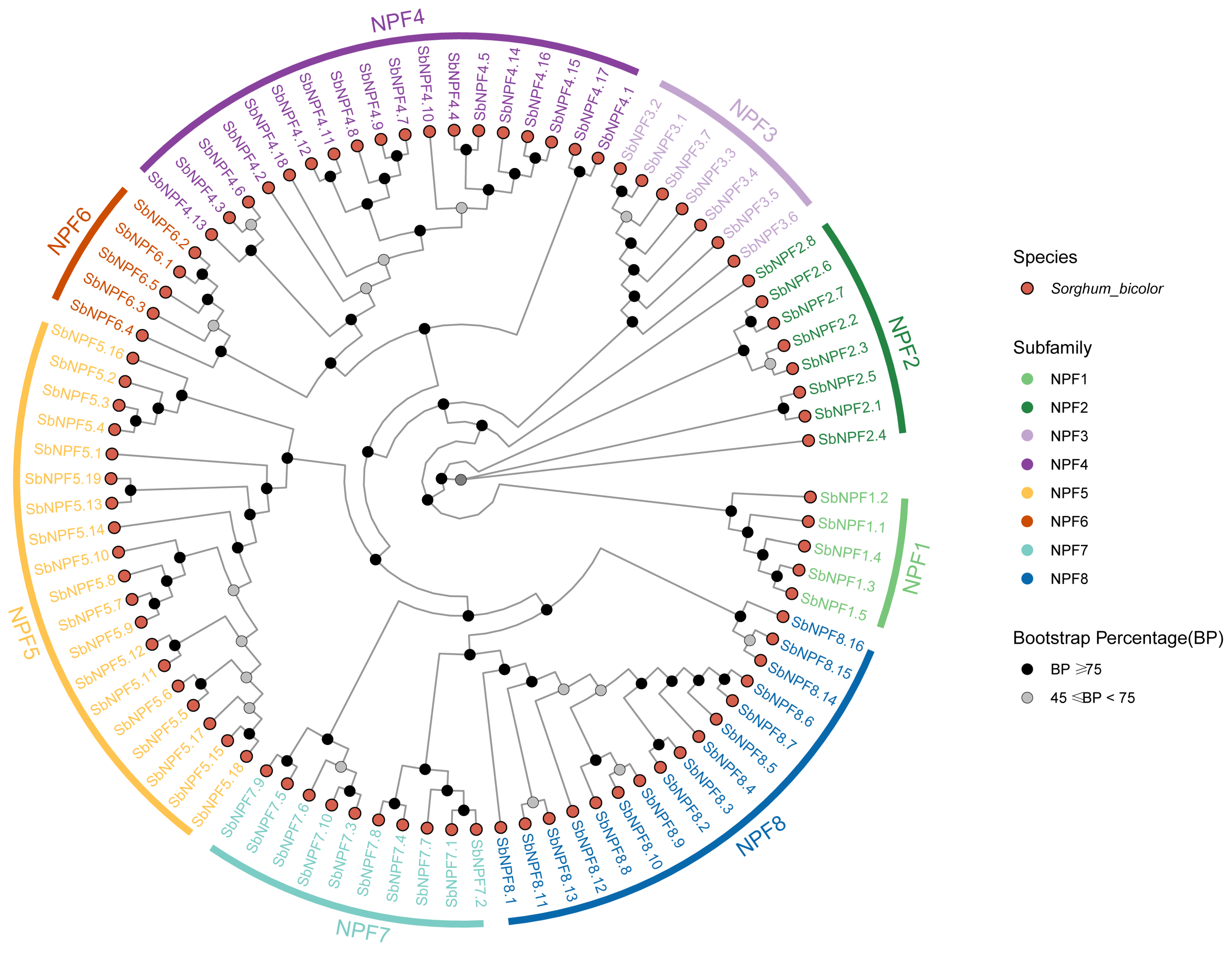 In summary, the sorghum NPF family has formed a complex functional network through the synergy of evolutionary conservation and species specificity. This study provides key targets for elucidating the molecular mechanisms underlying efficient nitrogen utilization in monocotyledonous crops and establishes a theoretical basis for the molecular breeding of low-nitrogen-tolerant sorghum varieties.