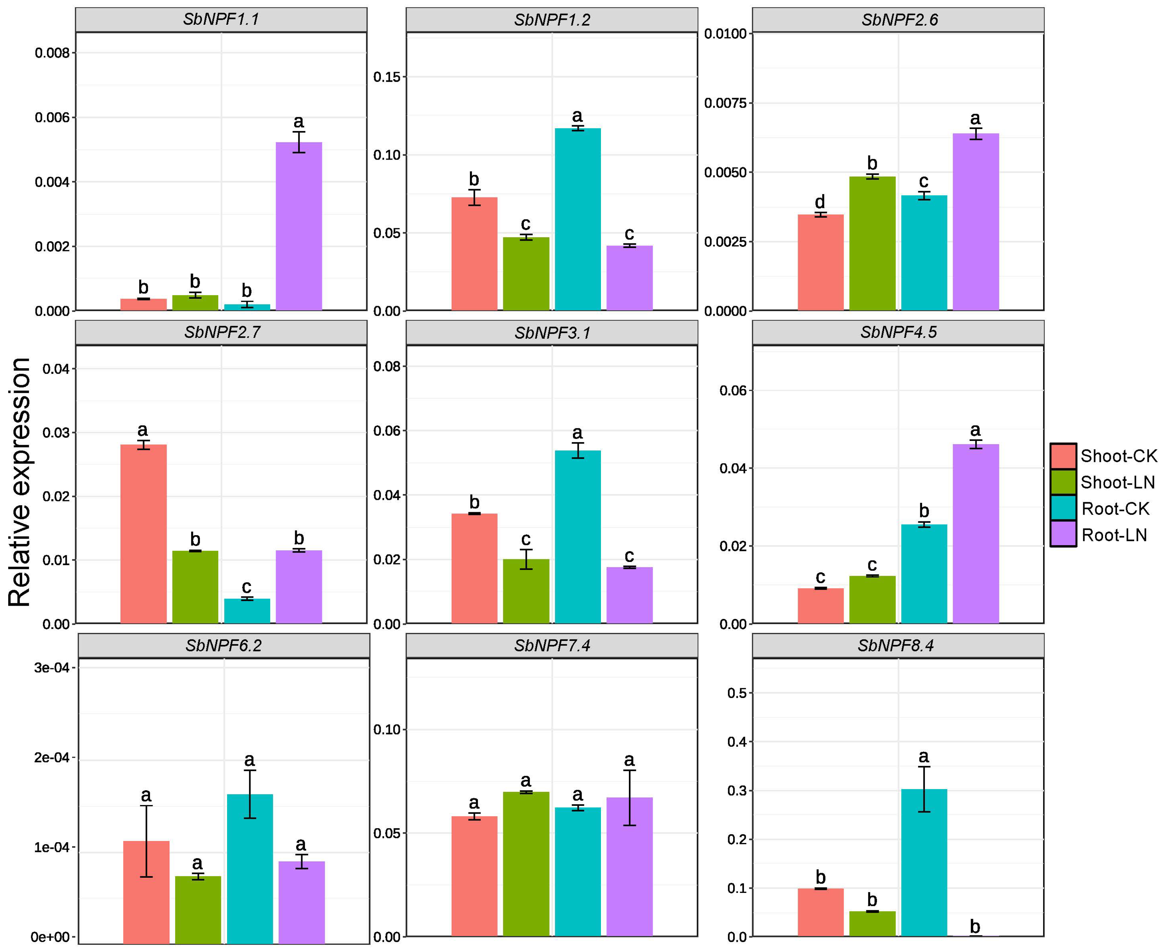 These expression patterns collectively indicate that SbNPF genes exhibit intricate and specific transcriptional regulatory behaviors in response to low nitrogen stress. This implies their potential involvement in coordinating plant adaptation to this nutrient-stress condition.