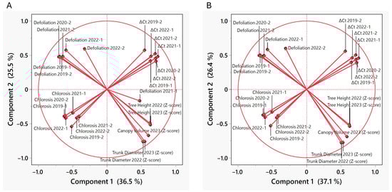 Vector plot (biplot) showing the correlations between the variables used and the two first principal components. (A) Biplot including all variables measured. (B) Biplot after eliminating the defoliation 2021-1 variable. Vector length indicates the magnitude of the variable’s contribution to the principal component. Vector direction indicates the correlation of the variable with the principal component. Vectors pointing in the same direction as a principal component are positively correlated, while vectors pointing in the opposite direction are negatively correlated. The percentages of the variance explained by each component are indicated in the axes.