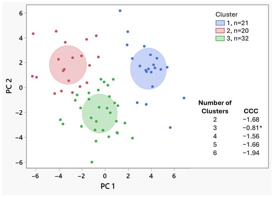 K-means biplot showing the three clusters identified as the best fit. Colors identifying the clusters are shown at the top right of the plot and the number of members (n) in each is also shown. The cluster comparison report appears on the bottom right of the plot. The number of clusters with the highest Cubic Clustering Criterion (CCC), highlighted with an asterisk, denotes the best fit. PC, principal component.