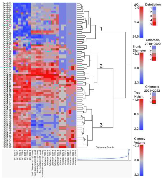 Hierarchical cluster heatmap (see legend for color values of each variable) and dendrogram based on CLas infection (∆Ct), growth variables (trunk diameter, tree height and canopy volume, as Z-scores), and disease development (defoliation and chlorosis), measured in the segregating progenies of Family 1 (Fam1) and Family 2 (Fam2). The distance graph is shown in the lower right corner, indicating how the distance criterion changes with each branch of the hierarchy. The horizontal coordinates represent the numbers of clusters, which decrease from left to right. The vertical coordinate is the distance between the clusters that were joined at the given step. The black vertical line marks the distance for the three main clusters. This distance levels off at this point, and the addition of more clusters, indicate that three is likely a natural grouping. Numbers on the dendrogram identify these three main clusters.