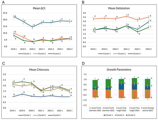 Means of the three clusters generated using Hierarchical cluster analysis (HCA). (A) ∆Ct, (B) defoliation, (C) chlorosis and (D) growth parameters (as Z-scores). Values are means ± standard error (SE), represented as vertical lines. Letters show significant mean differences using the Steel-Dwass method (A–C) or Tukey’s honestly significant difference (HSD) test (D). Means with the same letter are not significantly different.