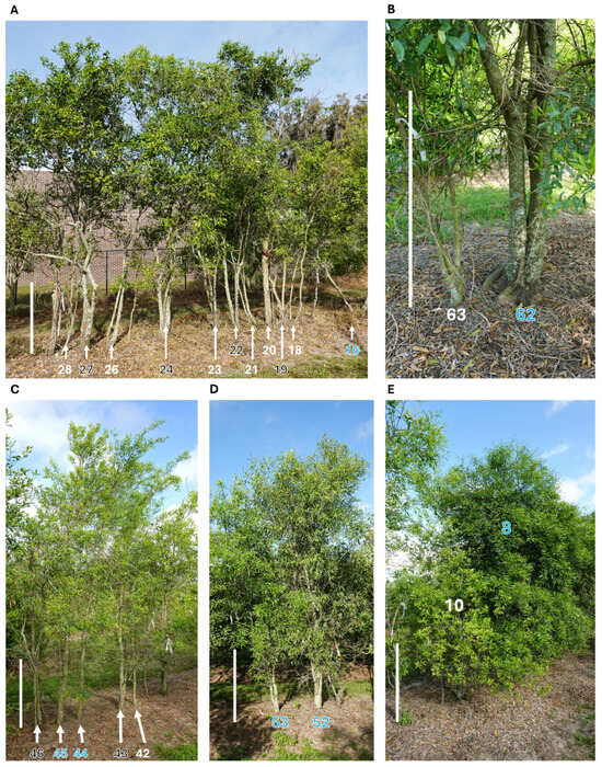 The segregating progeny photographed in April 2025. (A) Family 1 (Fam1) hierarchical cluster analysis (HCA) cluster 1 trees: Fam1-20, HCA cluster 2 trees: Fam1-16, 18, 21, 23, 26 and 28, and HCA cluster 3 trees: Fam1-19, 22, 24, and 27. Fam1-23 was included in cluster 3 using k-means clustering, all other trees had the same classification. (B) Family 2 (Fam2) trees Fam2-62 (HCA cluster 1) and Fam2-63 (HCA cluster 2) showing trunk differences. (C) Fam2 HCA cluster 1 trees: Fam1-44, Fam2-45, HCA cluster 2: Fam2-42, HCA cluster 3: Fam2-43 and Fam2-46. (D) Fam2 cluster 1 trees Fam2-52 and 53. (E) Canopy of Fam2-8 (HCA Cluster 3) and Fam2-10 (HCA cluster 2). The white vertical bar on the left of each panel = 1 m. Blue numbers indicate trees in HCA cluster 1, white numbers HCA cluster 2, and black numbers HCA cluster 3.