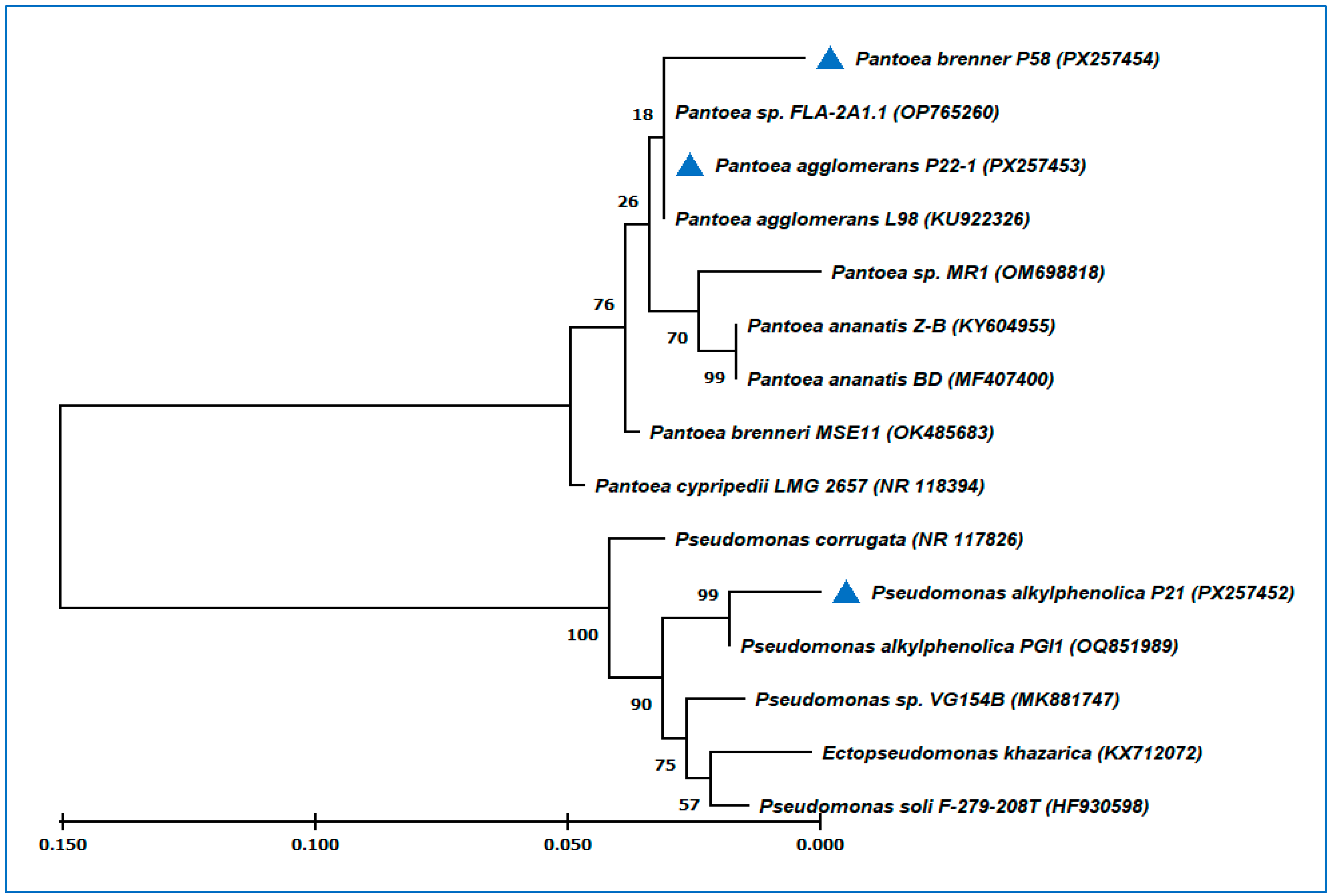 3.2. 16S rRNA Identification and Molecular Phylogentic Tree