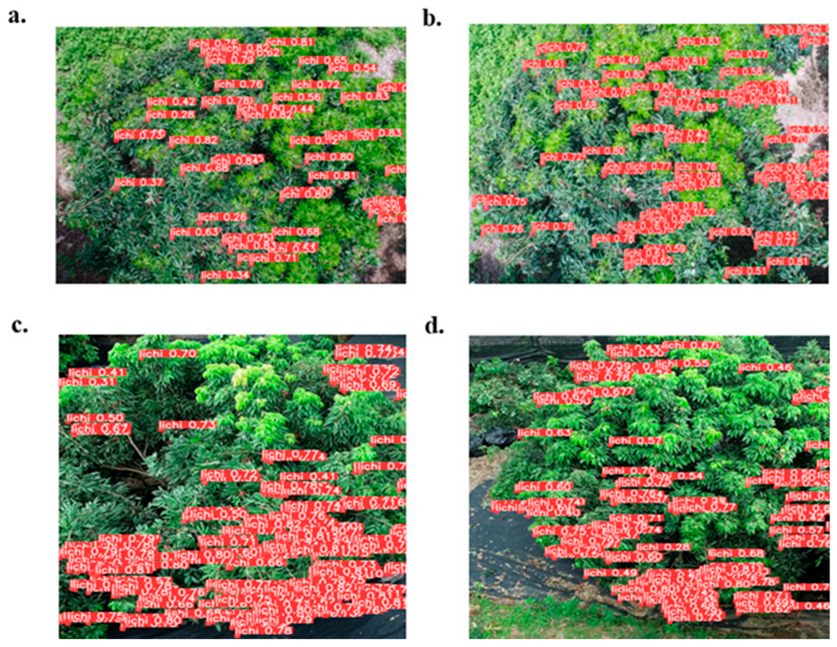- Liang, C.J.; Liang, J.T.; Yang, W.G.; Ge, W.Y.; Zhao, J.; Li, Z.R.; Bai, S.D.; Fan, J.W.; Lan, Y.B.; Long, Y.B. Enhanced visual detection of litchi fruit in complex natural environments based on unmanned aerial vehicle (UAV) remote sensing. Precis. Agric. 2025, 26, 23. [Google Scholar] [CrossRef]