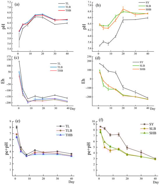 Changes in soil pH, Eh and pe + pH values over time under different biochar treatments ((a,c,e): TL soil; (b,d,f): SY soil).