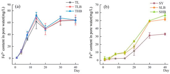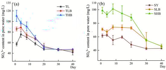 The changes in SO42− and Fe2+ contents in pore water are summarized in Figure S1. In TL soil, the SO42− content reached 108.2–117.3 mg L−1 on day 20 after treatment, while in SY soil, it reached up to 109.9–122.9 mg L−1 on day 30. In both soils, the SO42− content in HB was higher than that in LB.