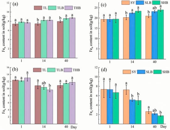 As shown in Figure 4b–d, biochar application reduced soil crystalline iron oxide (Fec) contents. On day 14, compared to TL, the Fec content in TLB and THB decreased by 10.3% and 13.9%, respectively. By contrast, in SY soil, on day 14, the Fec content under SLB and SHB treatments decreased by 29.3% and 31.1%, respectively, compared with SY. Moreover, On day 40, the concentrations of Fec under SLB and SHB treatments were 17.5% and 33.9% lower than that of SY.