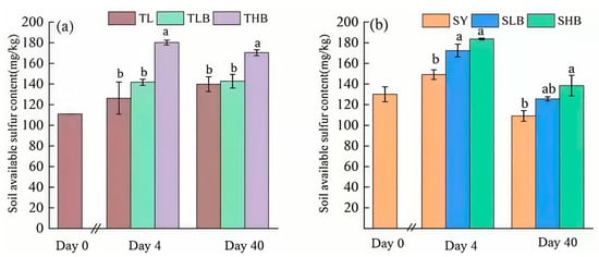 The dynamic changes in available S content are shown in Figure 5. In TL soil, on the 4th day of incubation, the available S content in TLB and THB was 12.1% and 42.5% higher than that in TL, respectively. On day 40, the content of available S in TLB and THB was 2.1% and 21.9% higher than that in TL, respectively. Similarly, in SY soil, on day 4, compared with SY, SLB and SHB increased soil available S by 15.6% and 23%, respectively. On day 40, the SLB and SHB treatments increased available S content by 15.2% and 27.0%, respectively.