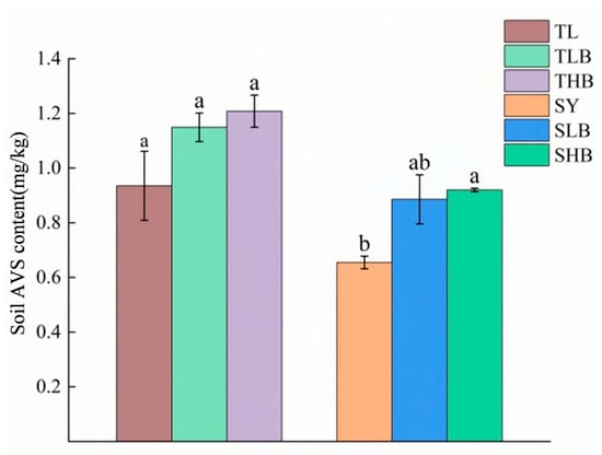 Results in Figure 6 demonstrate the content of acid-volatile sulfur (AVS) in soil. The AVS content of TL soil was higher than that of SY soil, and HB was more effective than LB in increasing soil AVS content. Compared to SY, the SLB and SHB treatments increased AVS concentrations by 36.1% and 40.4%, respectively.