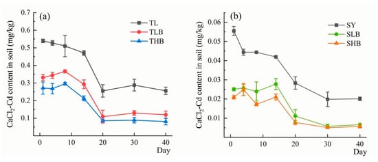 Results in Figure 7 show the content of CaCl2-extractable Cd (CaCl2-Cd) in soil. The concentration of CaCl2-Cd in soil initially decreased from day 0 to day 20, then tended to stabilize after day 20. On the 40th day of incubation, biochar application decreased CaCl2-Cd by 53.1% (TLB) and 68.3% (THB), respectively. Compared to SY, the reductions in CaCl2-Cd were 66.8% and 71.6% under SLB and SHB treatments, respectively.