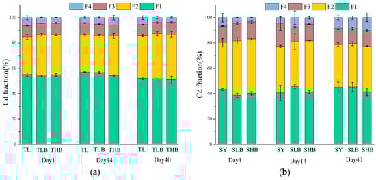 The changes in Cd fractions in soil are displayed in Figure 8. In TL soil, Cd primarily existed as F1-Cd. Comparatively, F2-Cd was the predominant Cd fraction in SY soil. Moreover, in TL soil, biochar application reduced the F1-Cd proportion by 1.9–4.6% on day 14. Compared to TL, the reduction in F1-Cd was 4.6% under the THB treatment. In SY soil, expect on day 14, biochar treatments reduced F1-Cd by 8.3–10.8%. Specifically, compared to SY, SLB decreased the proportion of F1-Cd by 10.8% on day 1. Additionally, biochar application increased the proportion of F2-Cd by 4.7–9.7%. Compared to SY, the increment in F2-Cd proportion under the TLB treatment was 9.7% on day 1. In SY soil, biochar increased the proportion of F2-Cd by 7.2–16.5%, with the SHB treatment increasing F2-Cd by 16.3% compared to SY on day 1. Compared to TL, the increment in F4-Cd under the THB treatment was 38.4% on day 14. In SY soil, SLB increased F4-Cd by 63.7% on day 14, while under the SHB treatment, F4-Cd was 23.7% higher than that in SY on day 40.