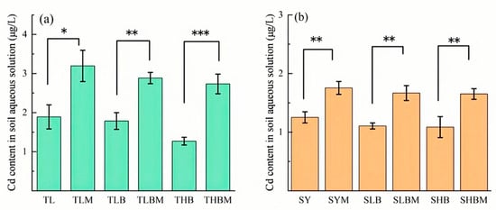 The cadmium content in water solutions under different biochar additions with molybdate treatment ((a): TL soil, (b): SY soil), Values are means ± SD (n = 3). Significant differences among treatments are indicated by asterisks: * p < 0.05, ** p < 0.01, *** p < 0.001 (one-way ANOVA followed by Duncan’s test).