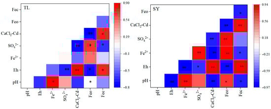 It is worth noting that the contribution of S to Cd immobilization was more significant in TL soil than in SY soil (Figure 9). The dynamic changes in pH and Eh showed significant differences between TL and SY soils. In TL soil, the pe + pH value decreased sharply from day 0 to day 8, and stabilized around 3.0 after day 20. When pe + pH was below 3.2, most SO42− in the soil was reduced to S2−, which could effectively induce Cd immobilization through the formation of CdS [9,35,36]. This inference is supported by the results of this study, where the reduction in SO42− was accompanied by a decrease in CaCl2-Cd content (Figure 10). Moreover, the anaerobic reduction in SO42− generates acid volatile sulfide (AVS), which can affect the bioavailability and toxicity of heavy metals [37]. Typically, AVS reacts with freely available divalent heavy metals in sediments and pore water to form relatively stable metal sulfides [38]. In this study, the increment in AVS partly contributed to the reduction in Cd availability (Table S2), which might be attributed to the S supplied by rape straw biochar.