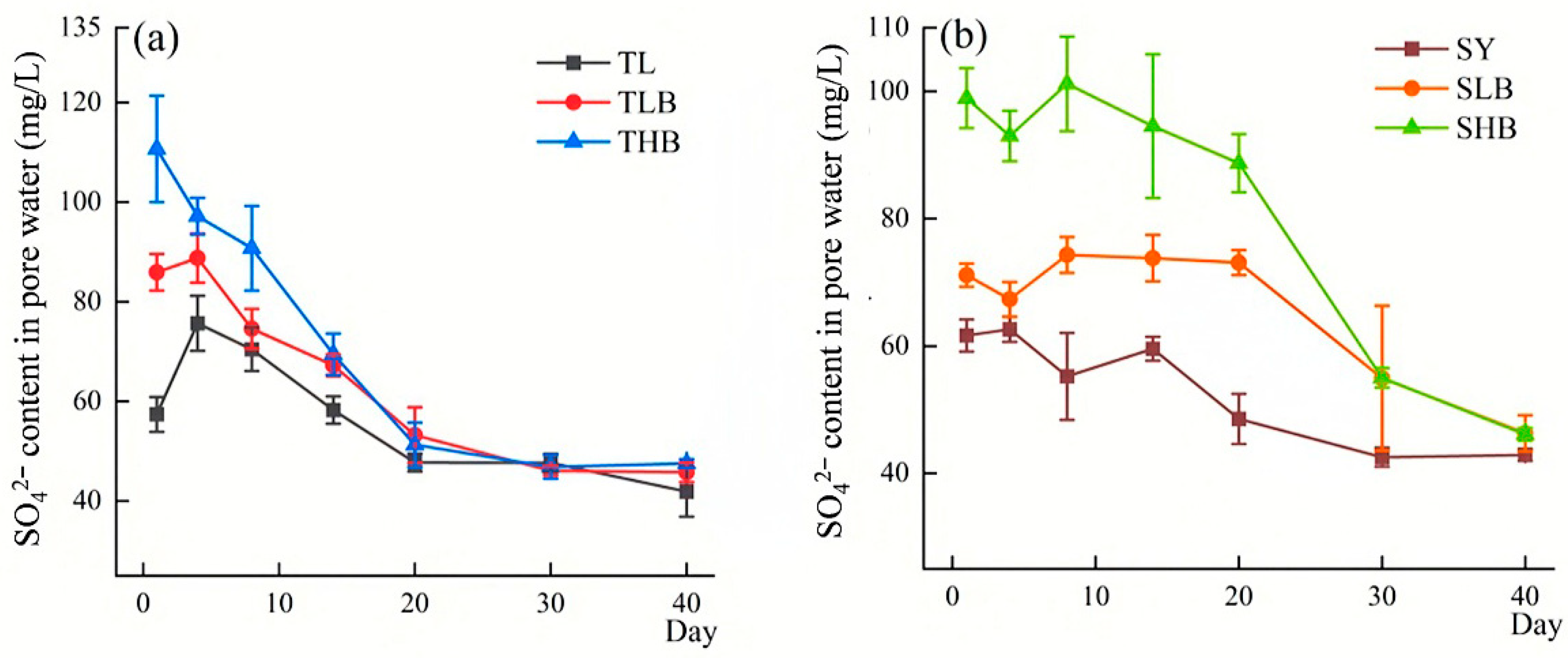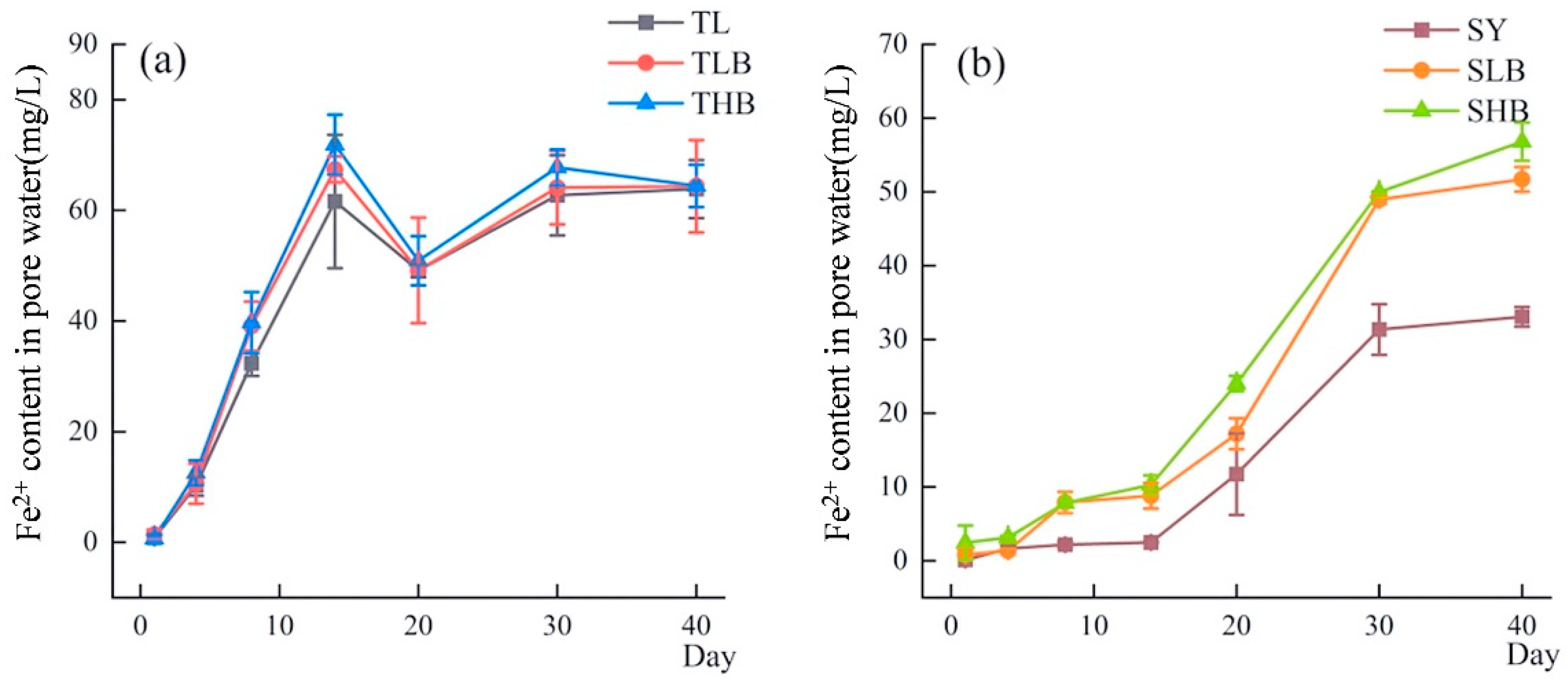 3.2. Changes of SO42− and Fe2+ Contents in Soil Pore Water