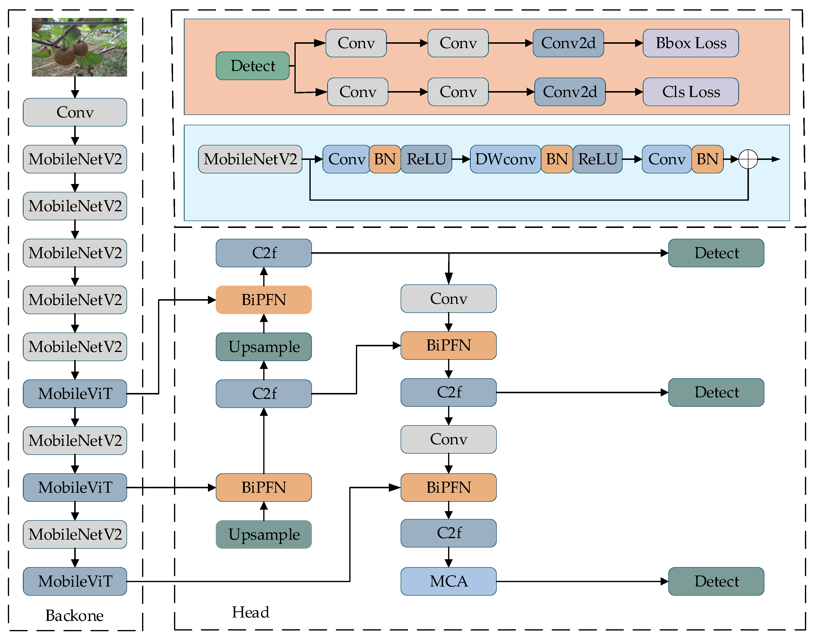 In the main network, the Conv and C2f modules are replaced with MobileViTv1 modules to reduce computational load and parameter count, thereby improving inference efficiency on mobile devices.