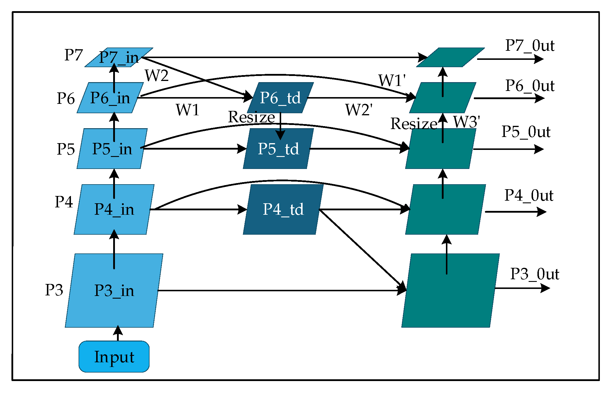 The bidirectional feature pyramid network (BiFPN) is introduced into the feature fusion layer of the base model to replace the original PANet structure, enhancing the model’s ability to distinguish between obstacles and backgrounds through the efficient fusion of cross-scale features.