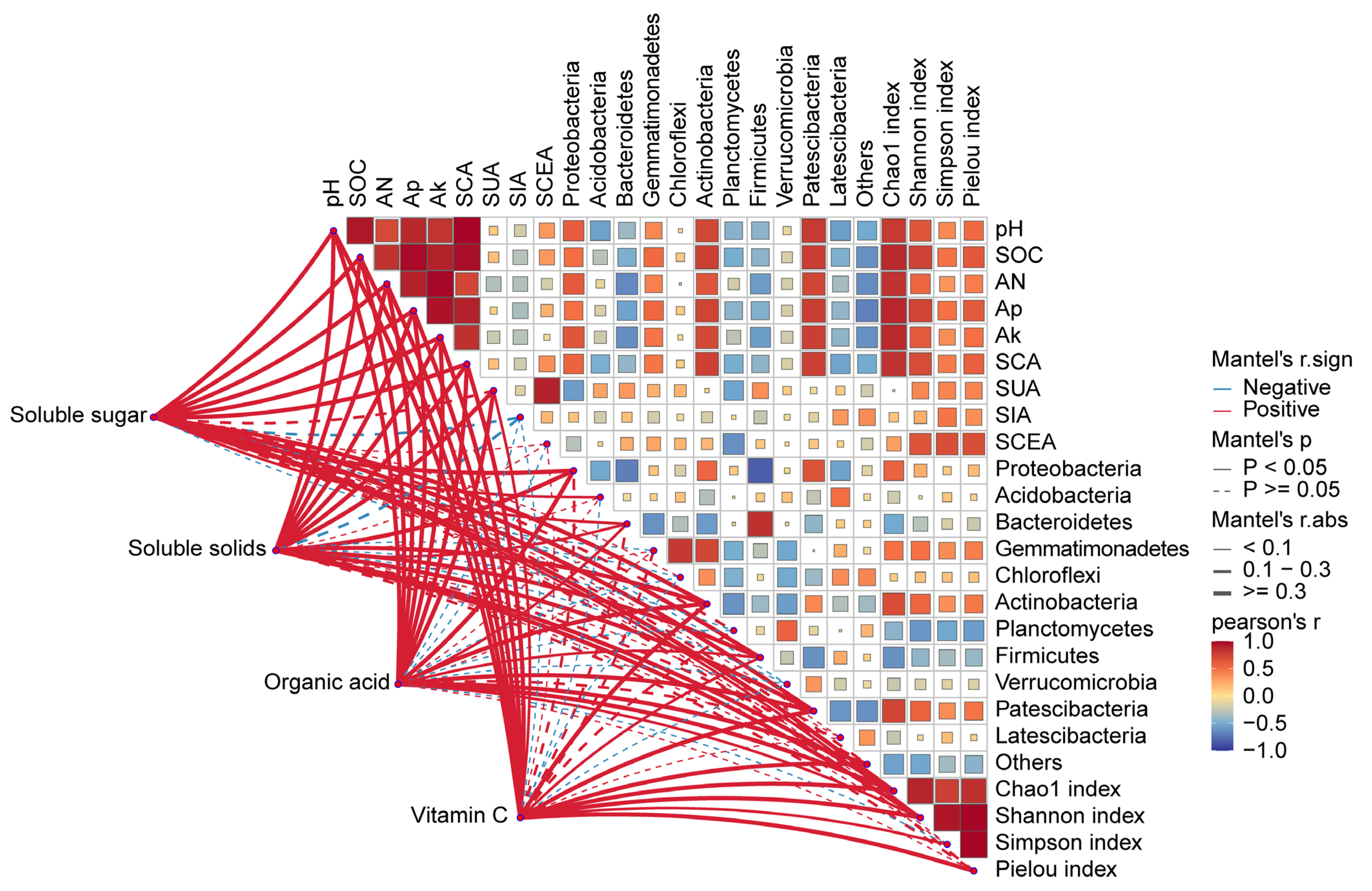 Figure 3. Correlation analysis of melon quality, soil physicochemical properties, soil enzyme activities, and soil bacterial community composition with different fertilization treatments.