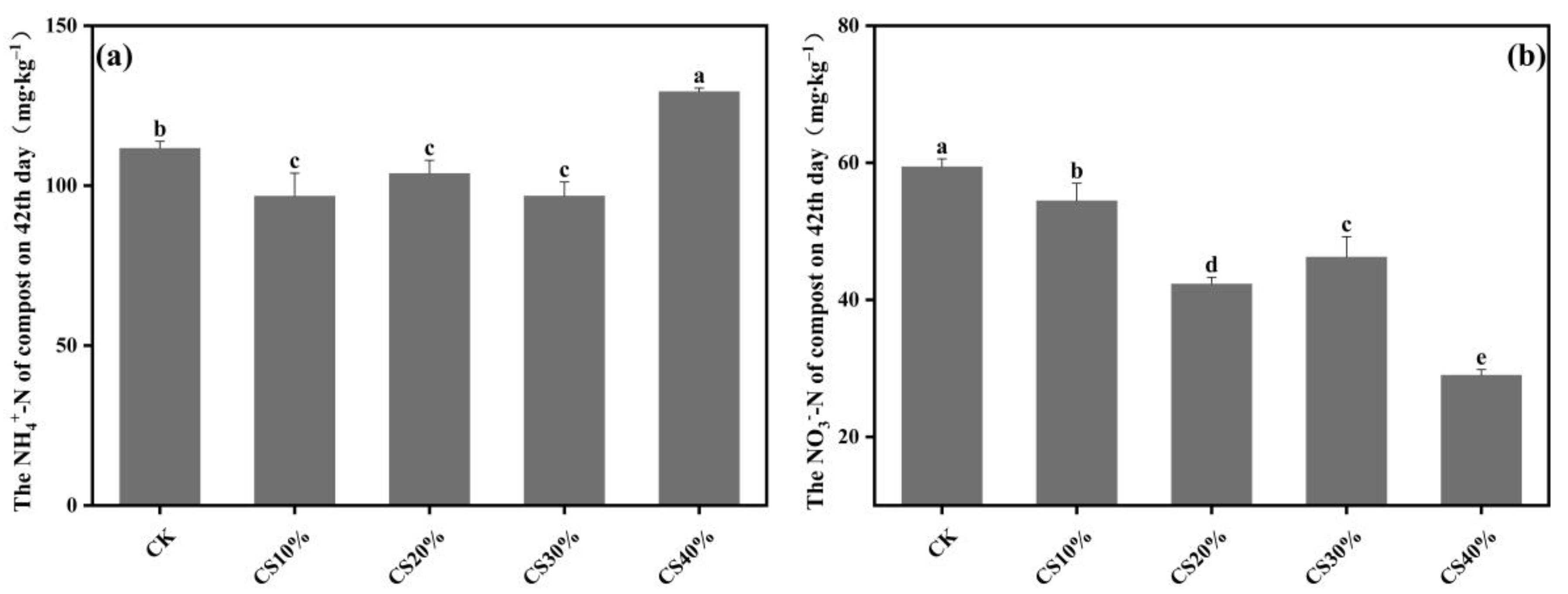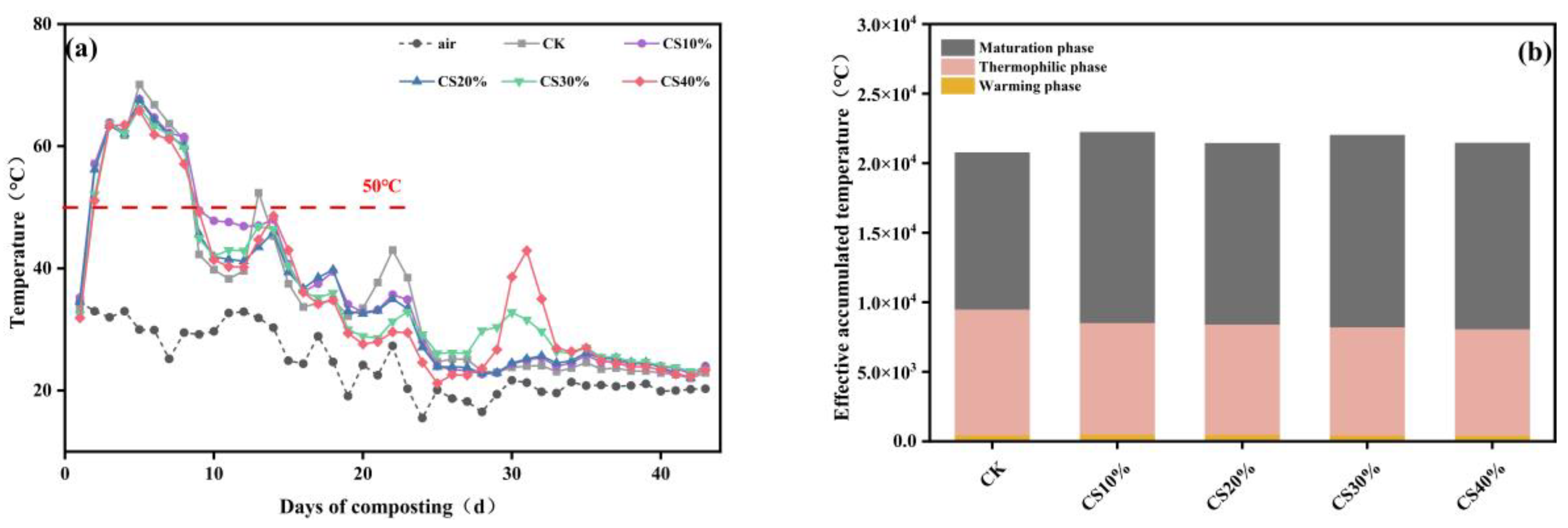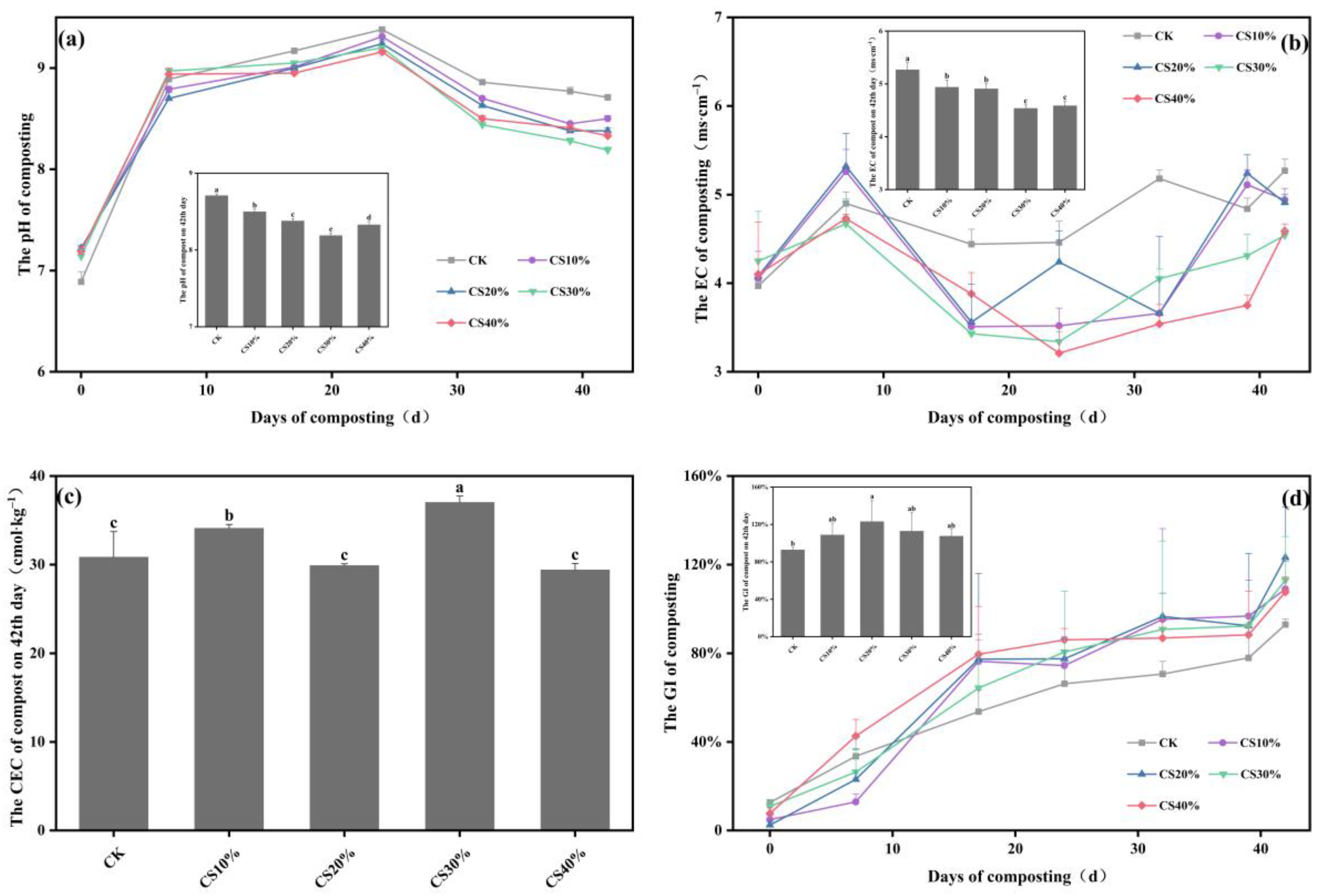 4.4. Effects of CS Addition on the Safety of Compost Products