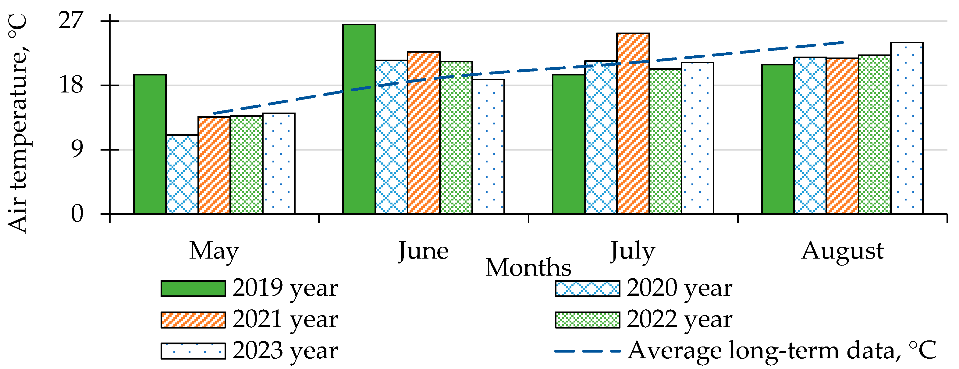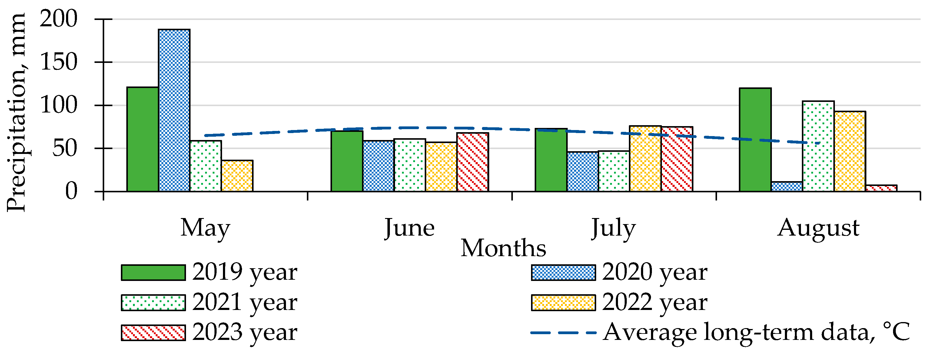 The research was conducted from 2019 to 2023 at the Institute of Potato Growing of the National Academy of Sciences of Ukraine, in collaboration with the Ulbroka Science Centre of the Latvia University of Life Sciences and Technologies. The experimental plots are located at 50°42′4″ N and 29°21′14″ E, with an elevation of 148 m above sea level. Meteorological observations for the four years of the study are presented in Figure 1 and Figure 2. The weather conditions during the potato growing season were quite heterogeneous, characterized by occasional critical temperatures, ranging from 1 to 2 °C during the night to hot midday temperatures of up to +34 °C. In June–July, there was a prolonged period with little to no atmospheric precipitation or insufficient amounts (mostly in the form of short-lived showers).