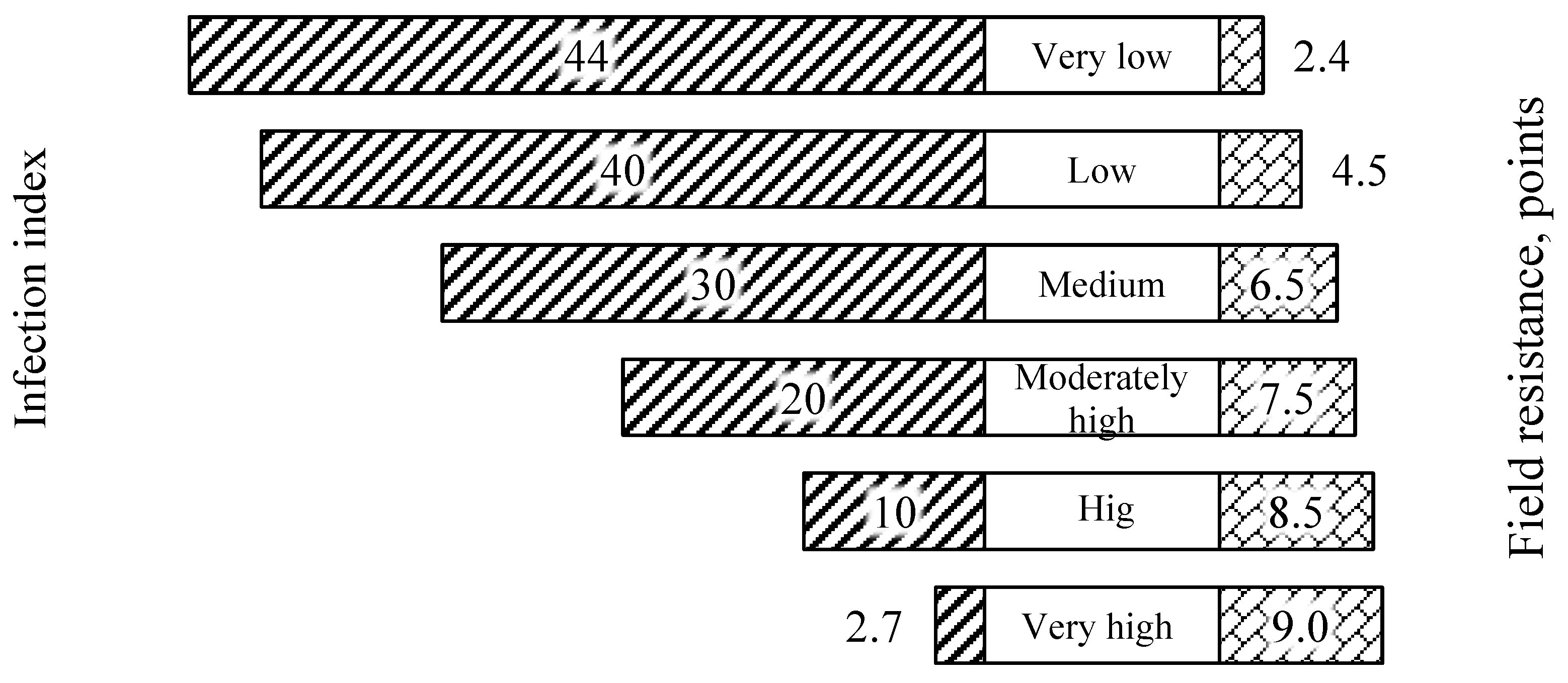 After summarizing the data for each assessment, the average infection index was determined. To assess the degree of resistance, varieties and hybrids were compared among themselves and with standard varieties. The higher the infection index, the lower the degree of resistance. Depending on the infection index, the breeding material was classified according to the degree of resistance (Figure 3).