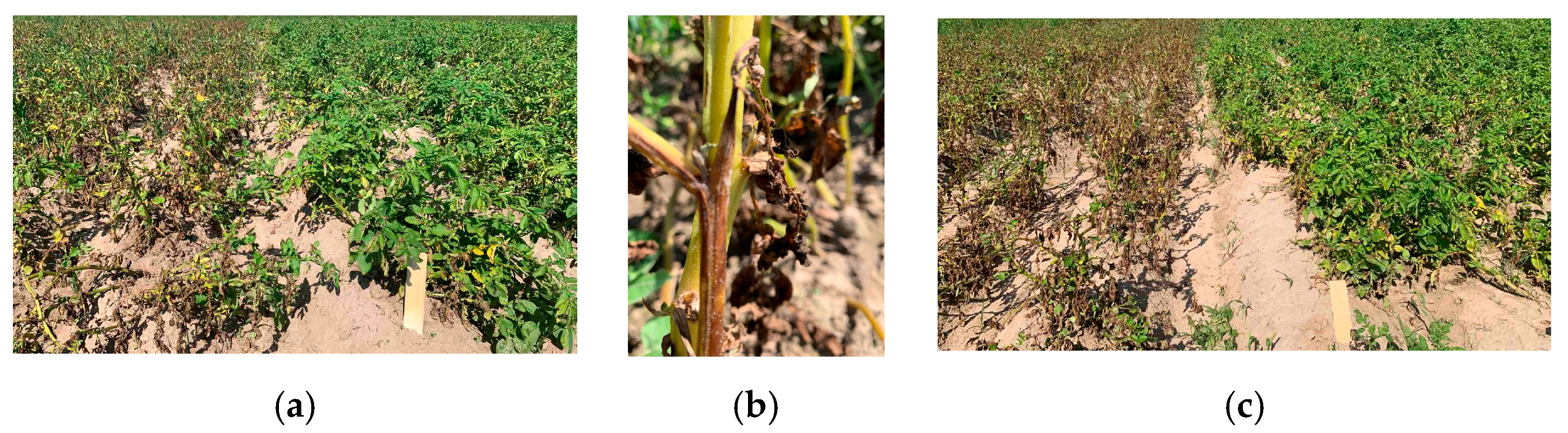 The field assessment of resistance to late blight of the above-ground leaf mass was carried out visually on a nine-point scale according to the standardized REI classifier [41]. The evaluations were performed dynamically 3–4 times during the season, determining the average resistance score (Figure 4a,b). The first evaluation took place from the moment of appearance of primary necrosis on late blight-susceptible varieties and hybrids: on 12 July 2020; 17 July 2021; 1 July 2022; 12 July 2023. Subsequent assessments were carried out 7–10 days after the first one, depending on the development stage of the disease (Figure 4c).