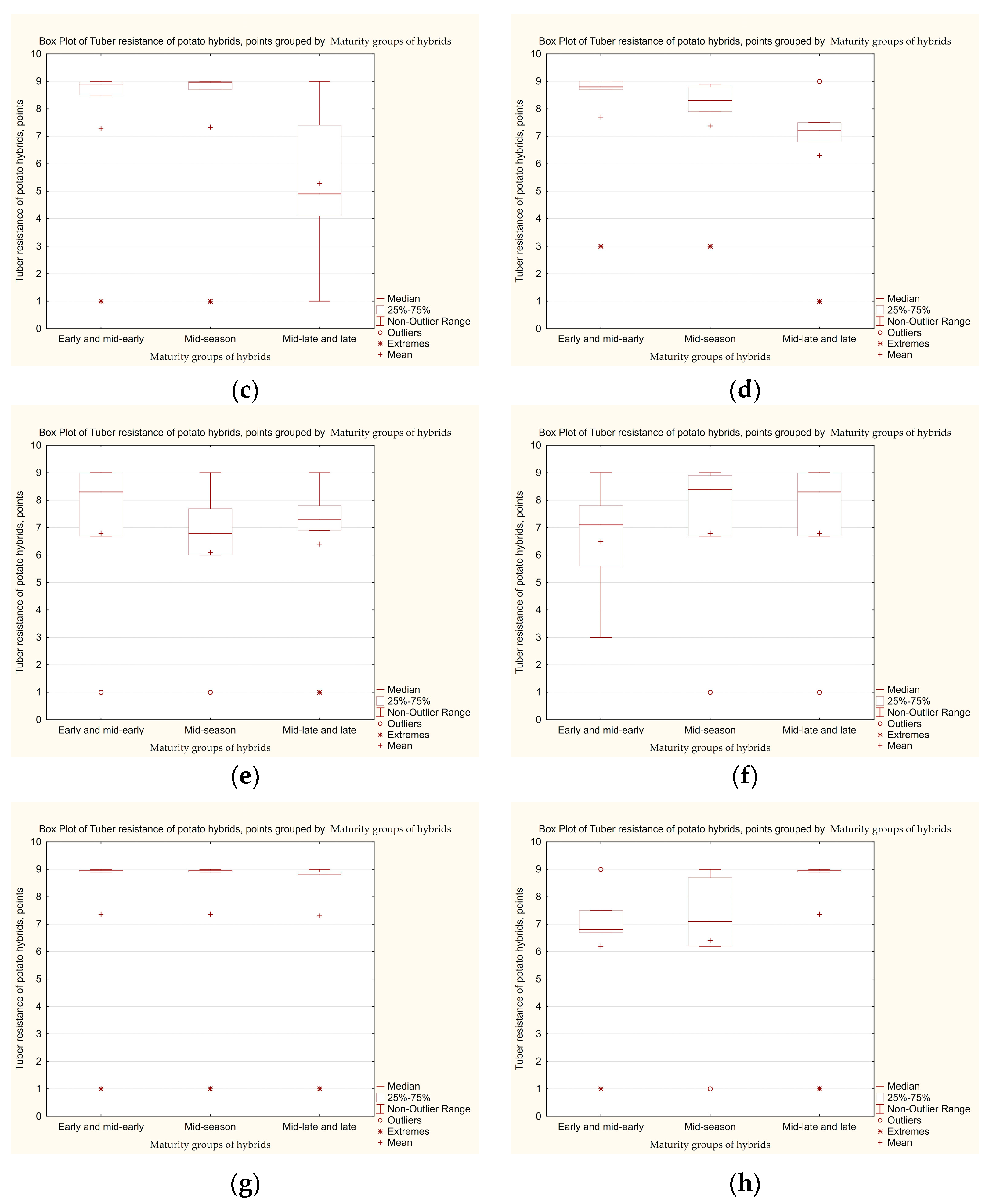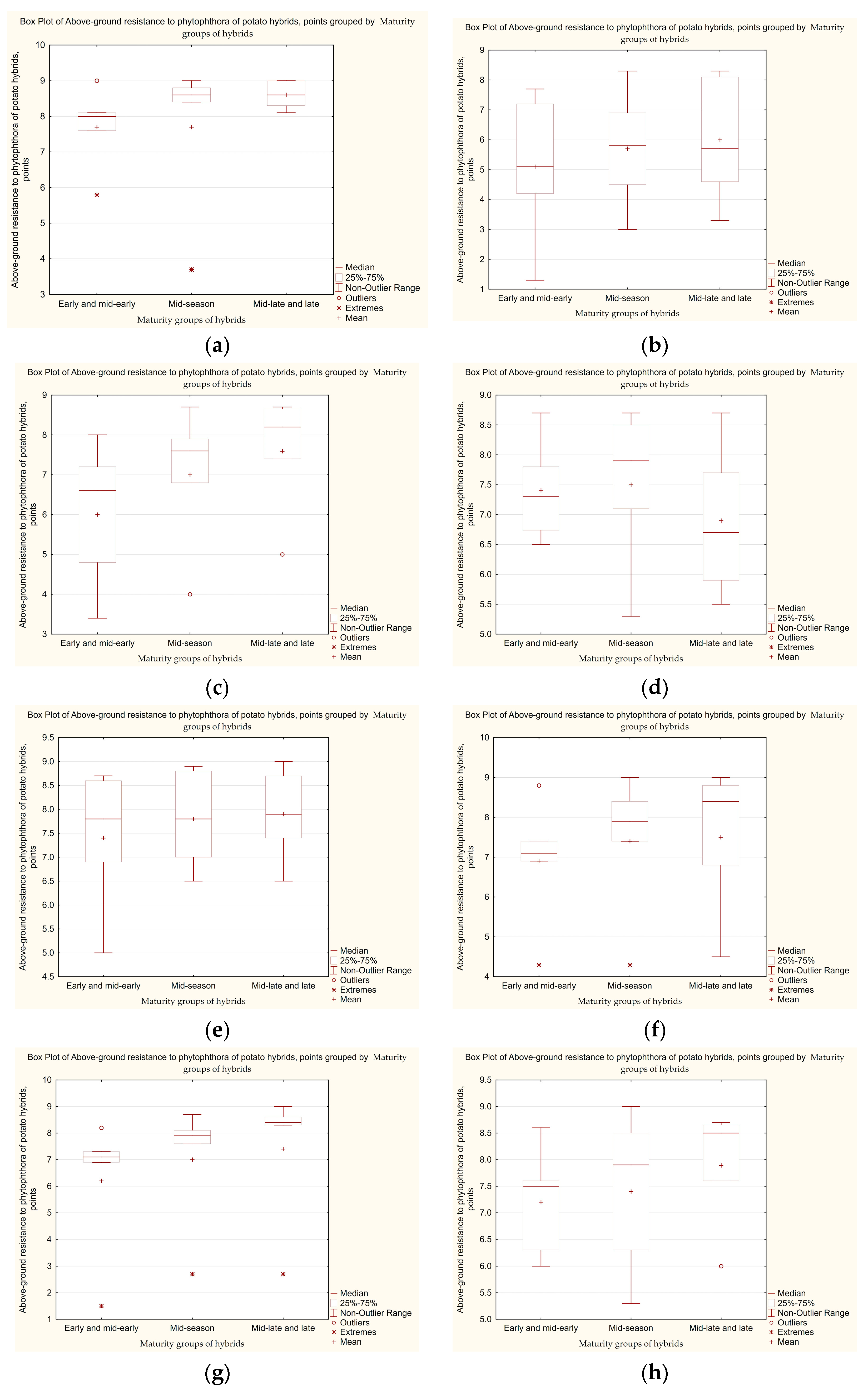 Figure 6 demonstrates the above-ground resistance of hybrids to late blight under artificial infection conditions. It consists of eight subgraphs (a–h), each of which corresponds to a specific set of hybrids and a year of study. Analysis of this graph allows one to assess the variability of the hybrid resistance in time, to identify the resistant variants, and track general trends, such as whether the resistance is improving in new hybrids or which years show the worst performance. The evaluation was carried out in the field on an artificial infection background, which was created in an area isolated from potato fields so that the budding–flowering phase of plants would occur during the period of wider spread of the oomycete. To obtain reliable data, five tubers of each test sample were planted, with a feeding area of 70 cm × 35 cm.
