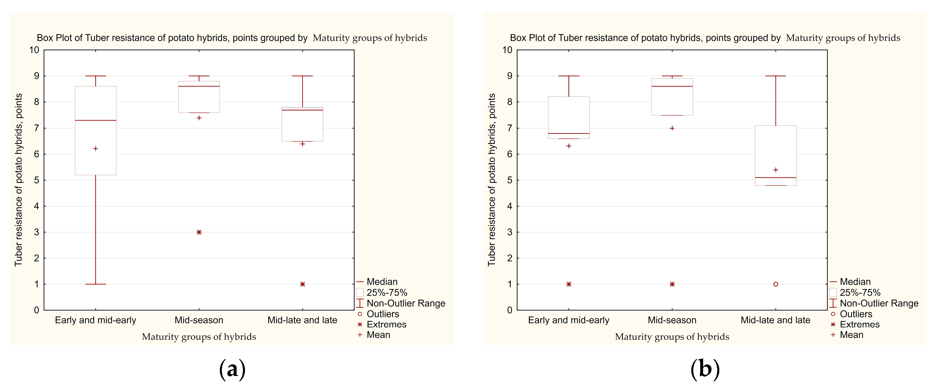Maturity Groups of HybridsYear of StudyNumber of SamplesMin–MaxAverage Resistance ScoreDistribution of Hybrids, %, by Tuber Resistance ScoresHybrids that Combine High (8–9 Points) Leaf and Tuber Resistance, %