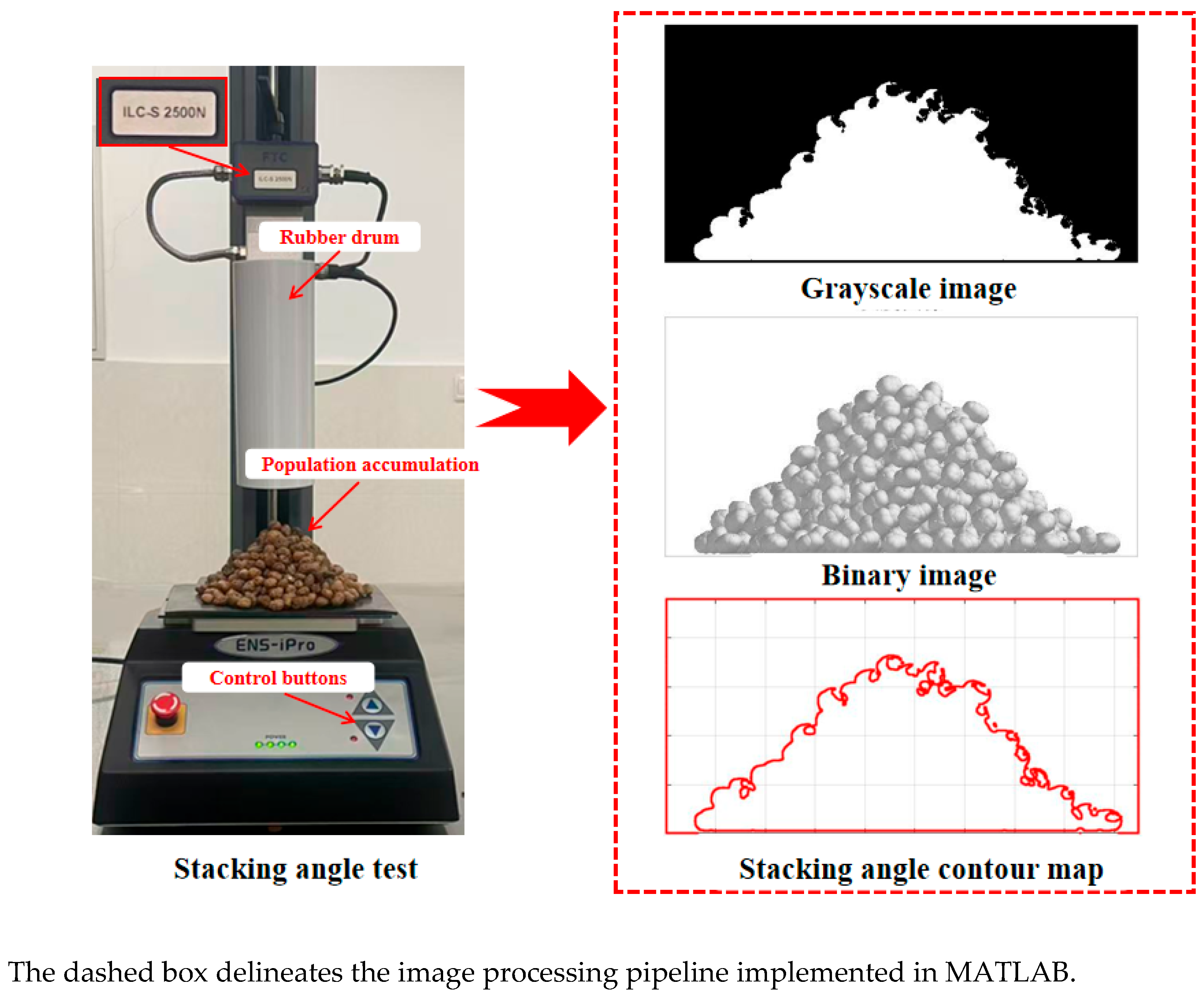 - Zheng, X.; He, X.; Shang, S.; Wang, D.; Li, C.; Shi, Y.; Zhao, Z.; Lu, Y. Calibration of Discrete Element Simulation Parameters for Tiger Nut Seeds and Experimental Validation. J. Agric. Mech. Res. 2024, 46, 172–178. [Google Scholar]