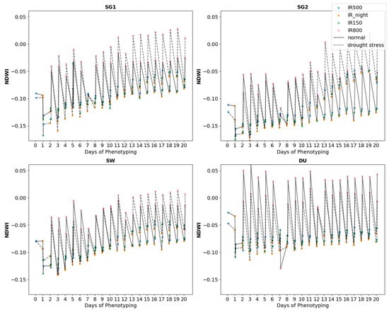 12]. This index helps evaluate the water content in vegetation, crucial for understanding the impact of drought stress on crops. In addition to NDWI, phenotypic responses under varying nitrogen levels and drought conditions can be further elucidated through T