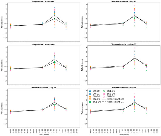 Infrared (IR)-based thermal imaging was conducted four times per day, with photosynthetic photon flux density (PPFD) set at 0 µmol photons m−2 s−1 (00:00 h), 150 µmol photons m−2 s−1 (11:15 h), 800 µmol photons m−2 s−1 (15:15 h), and 500 µmol photons m−2 s−1 (19:15 h) to reflect the diurnal cycle.