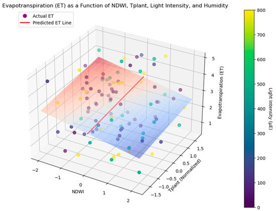 Light intensity amplified these effects, with the strongest correlations observed under high light conditions (D: 800 µE). This suggests that light-driven photosynthetic activity and stomatal behavior play a critical role in modulating ET under stress. The regression model for ET, which explained 74% of the variance, highlights the combined influence of NDWI, Tplant, and light intensity on transpiration dynamics. The inclusion of interaction terms further revealed that the effects of NDWI and Tplant on ET are more pronounced under drought stress, emphasizing the need to consider environmental and physiological interactions in crop stress studies.