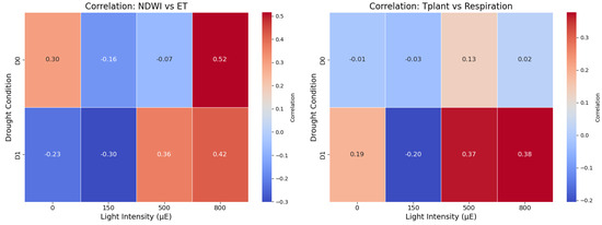 Figure 4). Strong positive correlations between NDWI and ET at higher light intensities under D0 indicate simultaneous increases in NDWI and ET, while the NDWI-ET relationship weakens under drought stress (D1). At midday to afternoon high light intensities, moderate correlations between T