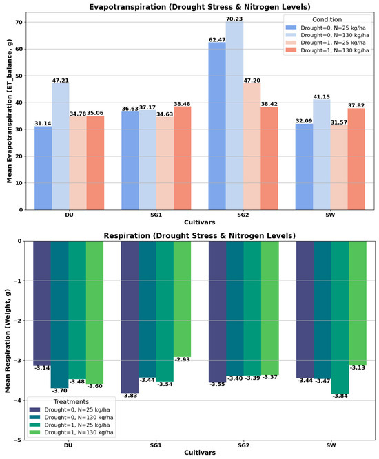 Figure 5). Barley cultivars SG1 and SG2 exhibit reduced evapotranspiration under drought stress, indicating higher water use efficiency. They maintain relatively higher respiration rates under drought stress, reflecting better stress tolerance. Wheat cultivars DU and SW show increased evapotranspiration with higher nitrogen levels (N130 kg/ha), promoting growth and water uptake. They exhibit lower stress tolerance as indicated by their lower respiration rates under drought stress.
