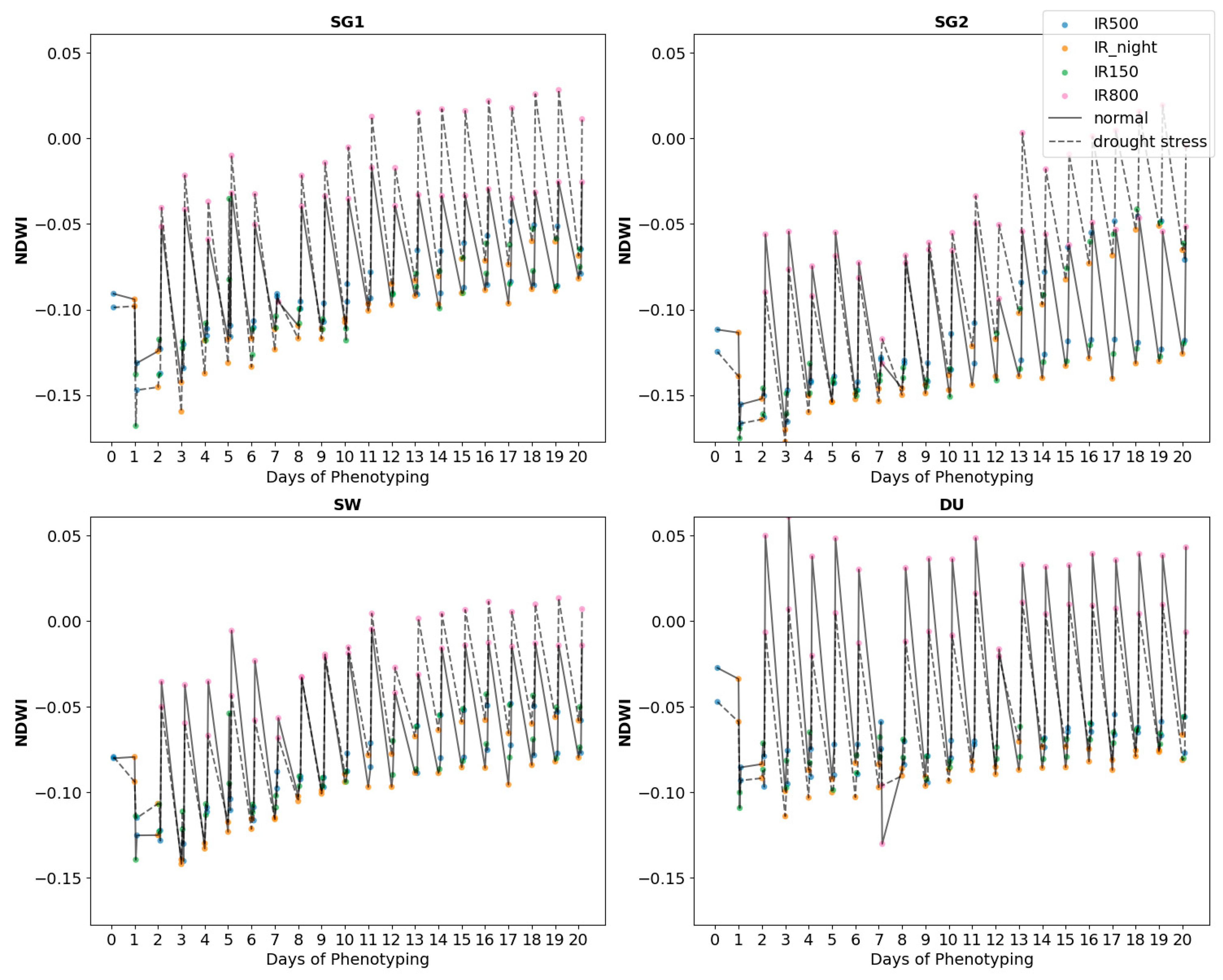 Figure 1. NDWI (Normalized Difference Water Index) measured for barley and wheat cultivars following nitrogen and drought stress treatments over phenotyping days. VNIR-SWIR hyperspectral imaging measurements made at IR500 (500 μE at 19:15 h), IR_night (0 μE at 00:00 h), IR150 (150 μE at 11:15 h) and IR800 (800 μE at 15:15 h). Solid line indicates no drought, and dashed line indicates drought stress. Values represent the average of three biological replicates per treatment. Each pot replicate consisted of 10 plant seedlings.