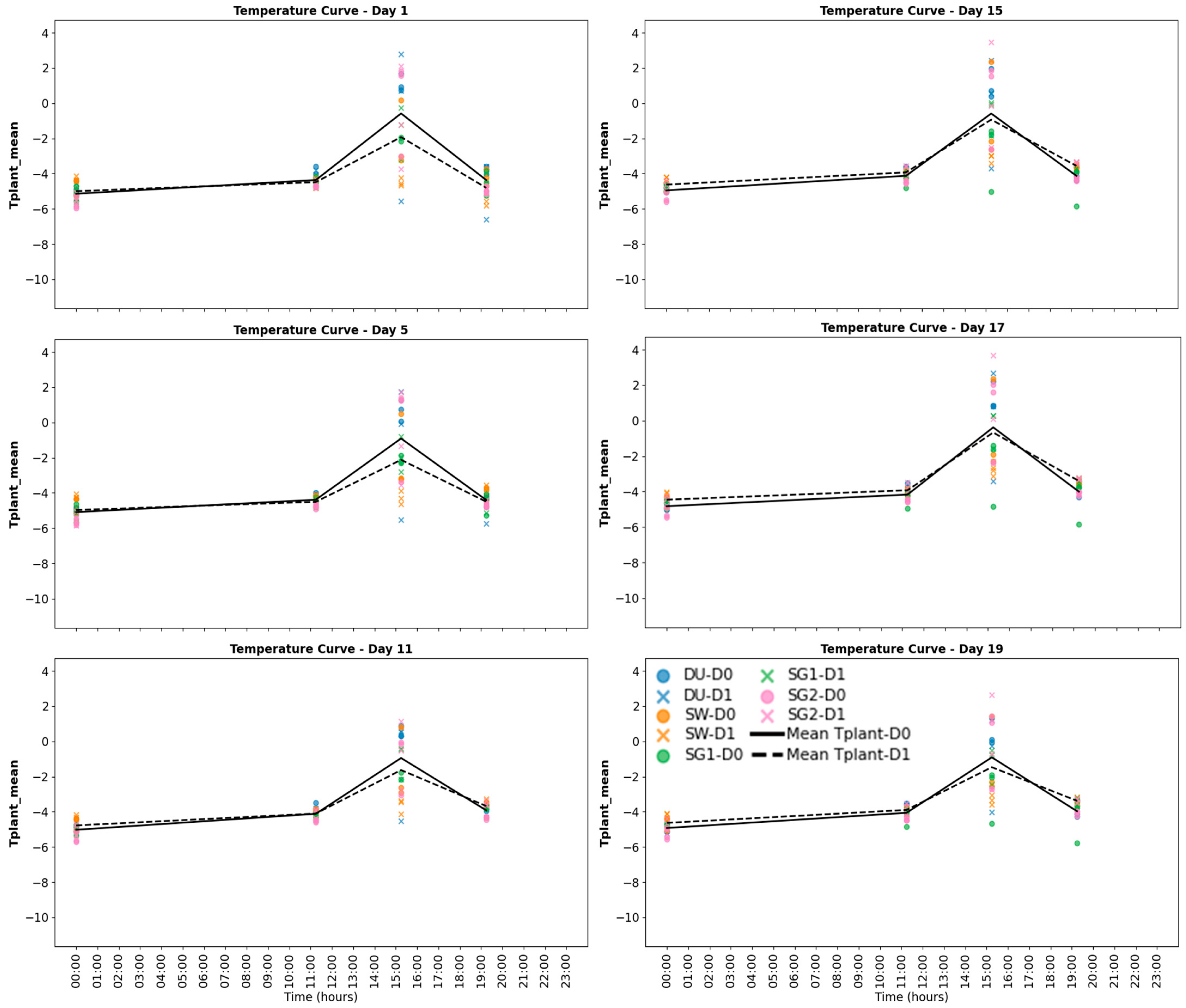 Figure 2. Tplant (Mean Plant Temperature (°C)) for wheat (DU, SW) and barley (SG1, SG2) cultivars following nitrogen and drought stress treatments (D0—No drought and D1—drought stress) measured over phenotyping period using InfraRed imaging measurements made at diurnal (daily) light cycle. Values represent the average of three biological replicates per treatment. Each pot replicate consisted of 10 plant seedlings.