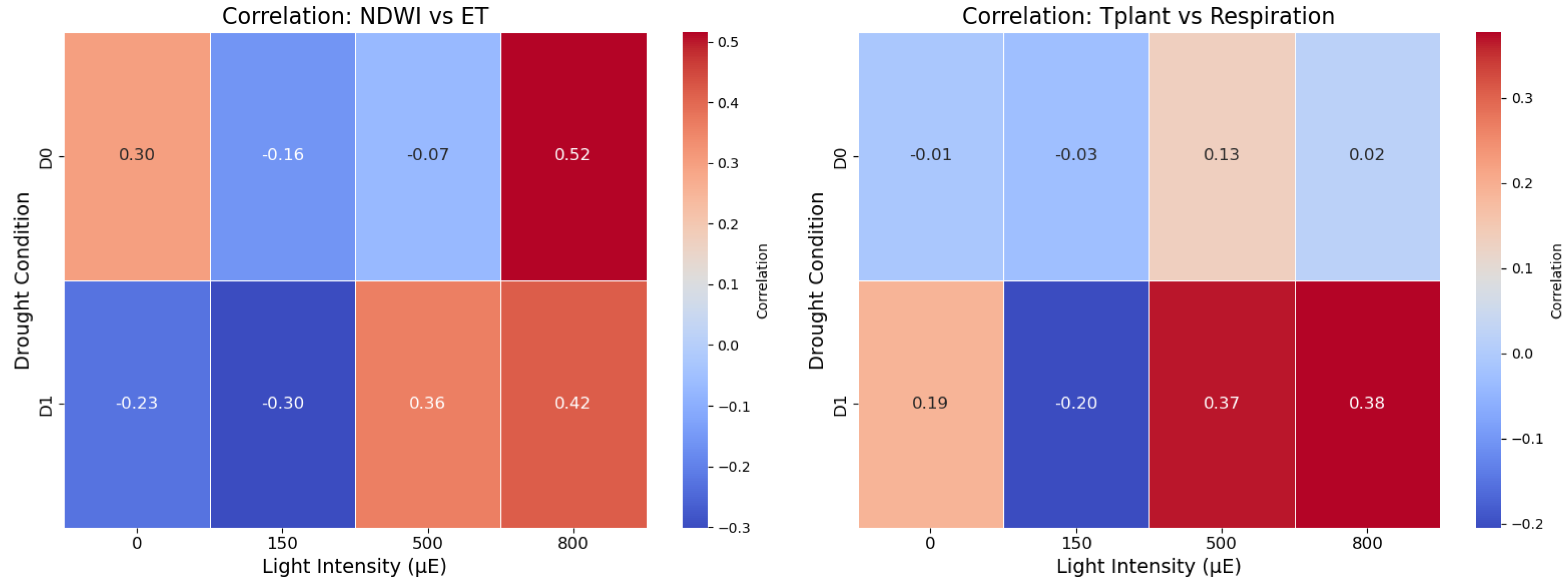 Figure 4. Heatmaps providing insights into differential impacts of drought and light on evapotranspiration and respiration. (Left). Correlation between NDWI and ET across drought conditions (D0 and D1) and light intensities (0, 150, 500, 800 µE). (Right). Correlation between Tplant and Respiration across the same conditions.