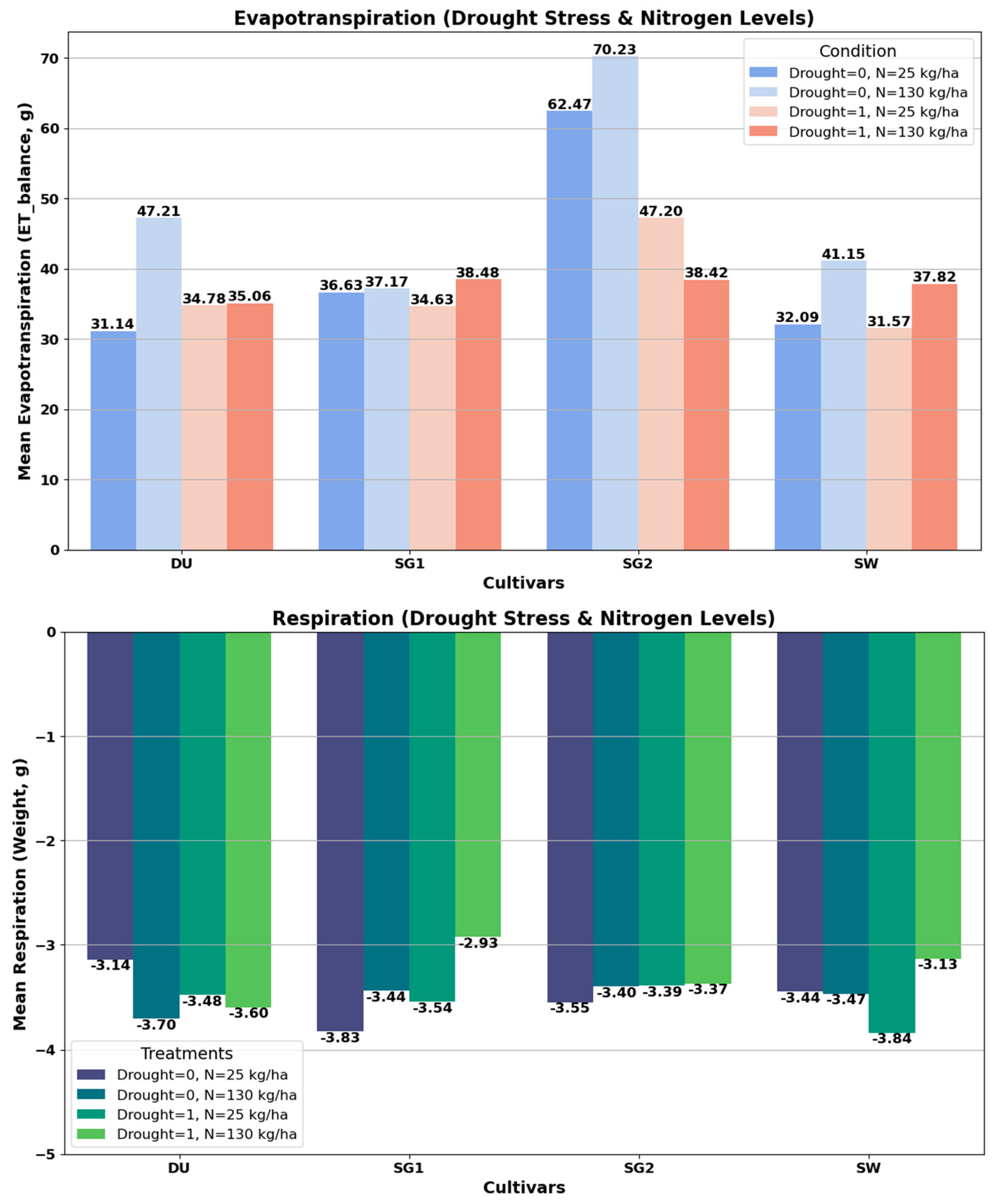 Real-time ET measurements provide cultivar-specific water loss patterns under drought and nitrogen treatments, effectively capturing the immediate physiological responses of wheat and barley cultivars (Figure 5). Barley cultivars SG1 and SG2 exhibit reduced evapotranspiration under drought stress, indicating higher water use efficiency. They maintain relatively higher respiration rates under drought stress, reflecting better stress tolerance. Wheat cultivars DU and SW show increased evapotranspiration with higher nitrogen levels (N130 kg/ha), promoting growth and water uptake. They exhibit lower stress tolerance as indicated by their lower respiration rates under drought stress.