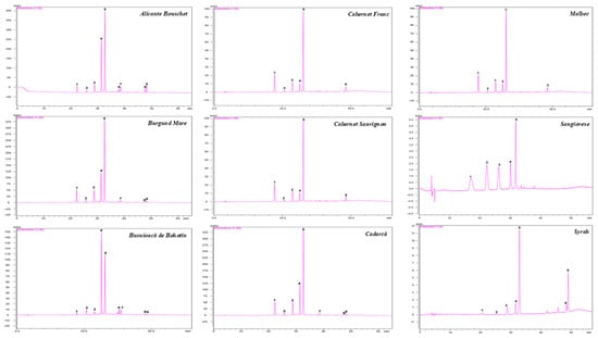 The HPLC chromatogram for anthocyanin separation in grape (V. vinifera L.) cultivars. 1 = Delphinidin-3-O-glucoside; 2 = Cyanidin-3-O-glucoside; 3 = Petunidin-3-O-glucoside; 4 = Peonidin-3-O-glucoside; 5 = Malvidin-3-O-glucoside; 6 = Peonidin-3-O-acetylglucoside; 7 = Malvidin-3-O-acetylglucoside; 8 = Peonidin-3-O-p-coumaroylglucoside; 9 = Malvidin-3-O-p-coumaroylglucoside (Peak numbers correspond with those from Table S1). Individual anthocyanins were identified based on HPLC-ESI-MS analysis.