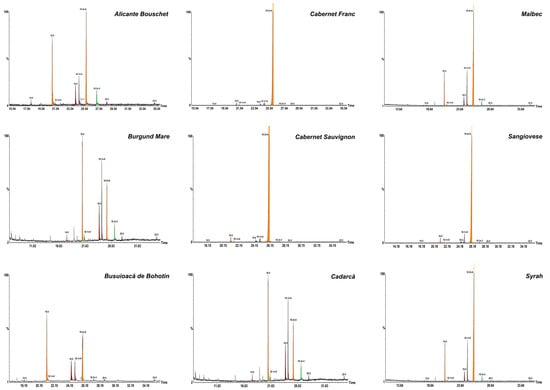 The fatty acid composition of whole grape berries oils is listed in Table 4 and Table 5. Figure 2 displays the comparative GC–MS chromatograms of FAMEs obtained from all cultivars, highlighting the differences in their fatty acid composition. Based on fatty acid distribution, the cultivars can be grouped in two distinct categories. The first group (Ali cante Bouschet, Burgund Mare, Busuioacă de Bohotin, Cadarcă, Malbec, and Syrah) exhibited wide variability in fatty acid profiles. In contrast, the second group (Cabernet Sauvignon, Cabernet Franc, and Sangiovese) displayed more homogeneous compositions. The dominating fatty acids were linoleic (C18:2n-6), palmitic (C16:0), and oleic (C18:1n-9) acids. Linoleic acid was predominant in 7 out of the 9 cultivars analyzed, with the highest levels found in Cabernet Franc and Cabernet Sauvignon cultivars (>95%). Exceptions were Burgund Mare and Cadarcă, where palmitic acid was slightly more abundant than linoleic acid. Minor fatty acids, including myristic (C14:0), cis-7-hexadecenoic (C16:1n-9), vaccenic (C18:1n-7), α-linolenic (C18:3n-3), arachidic (C20:0), and behenic acid (C22:0), were detected in all cultivars in trace amounts (<2%).